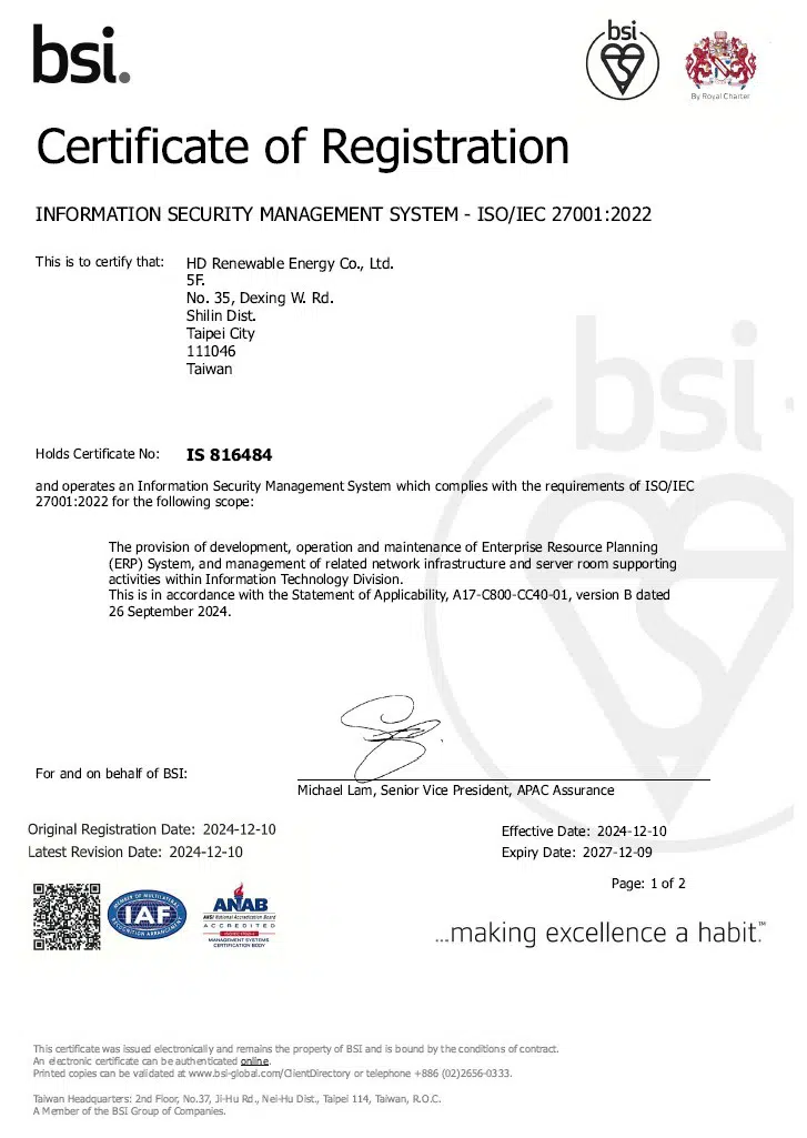- 2024導入ISO 27001(2022版)資訊安全管理系統,制定內部管理方案,結合PDCA進行持續改進,並取得第三方驗證,有效期限為2024/12/10~2027/12/09。